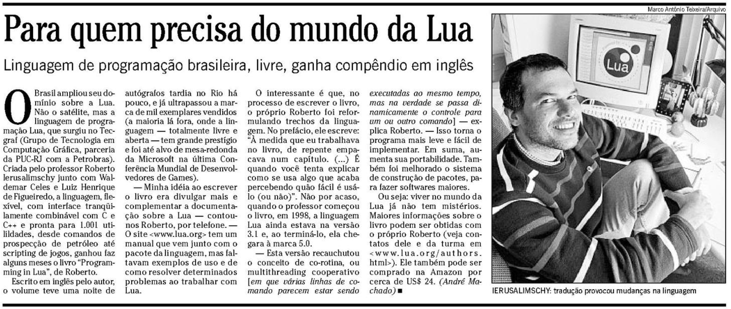 O Brasil ampliou seu domínio sobre a Lua. Não o satélite, mas a linguagem de programação Lua, que surgiu no Tecgraf (Grupo de Tecnologia em Computação Gráfica, parceria da PUC-RJ com a Petrobras). Criada pelo professor Roberto Ierusalimschy junto com Waldemar Celes e Luiz Henrique de Figueiredo, a linguagem, flexível, com interface tranqüilamente combinável com C e C++ e pronta para 1.001 utilildades, desde comandos de prospecção de petróleo até scripting de jogos, ganhou faz alguns meses o livro Programming in Lua, de Roberto.