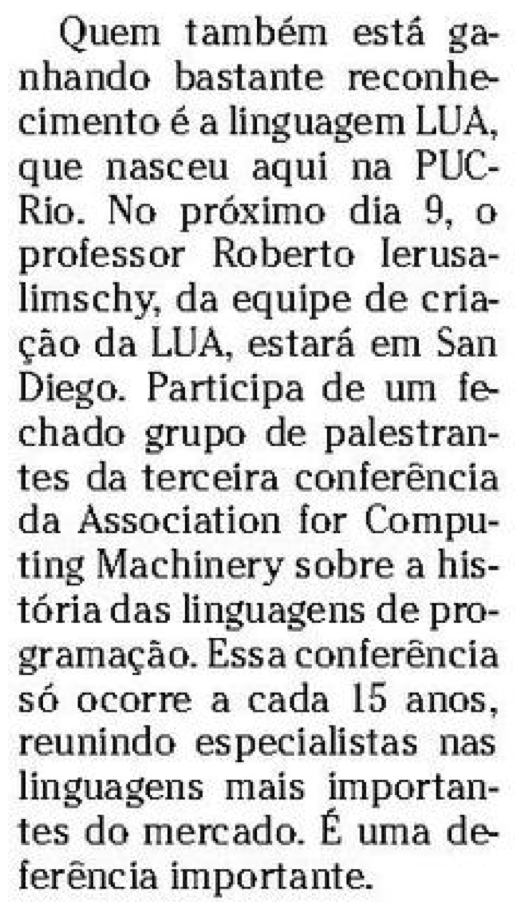 I first heard of Lua eight years ago, when I traveled to Rio de Janeiro to interview software engineers for a research project that was recently published as a book, Coding Places. While in Rio, I met "Rodrigo" (who has asked to remain anonymous), who worked on a free and open-source web platform. He surprised me by telling me that the project was based on a new programming language, Lua, developed by a small team at Pontifícia Universidade Católica do Rio de Janeiro (PUC-Rio), where Rodrigo had been a student.