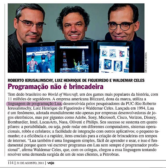 Durante três anos, entre as paredes do Departamento de Informática da PUC-Rio, os cariocas Roberto Ierusalimschy, Luiz Henrique de Figueiredo e Waldemar Celes criaram uma linguagem de programação que acabou se tornando o "xodó" dos desenvolvedores de games.